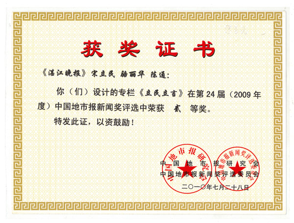 《湛江晚报》的时评专栏《立民立言》在第24届(2009年度)中国地市报新闻奖二等奖。宋教授一年来在该专栏发表新闻评论近二百篇。
