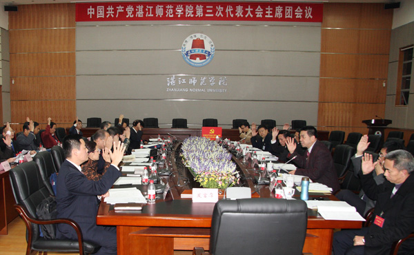 湛师新闻网12月18日讯 今天晚上,我校第三次党员代表大会主席团在学校国际会议厅举行第二次会议,主席团的27位成员了出席会议,会议由学校党委副书记、第三次党代会执行主席刘海涛同志主持。