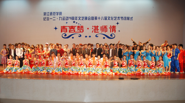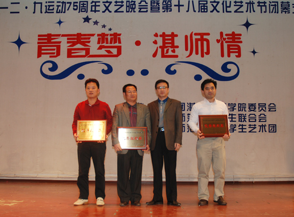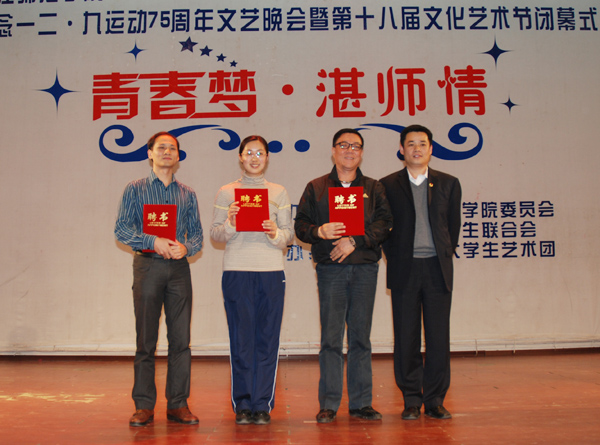 精彩的晚会在经久不息的掌声中落下帷幕。同时,我校第十八届文化艺术节的所有项目也全部结束,文化艺术节的顺利开展促进了我校学生综合素质的提高,为学生提供展现自我的舞台,也选送了一批优秀人才代表学校参加全省的比赛,并根据各二级学院组织各项活动的工作情况评出人文学院、信息学院和音乐学院为本届文化艺术节的优秀组织奖。出席晚会的领导分别为获奖单位和个人颁奖,并为艺术团优秀指导老师颁发聘书。最后表彰的是在湛江师院纪念一二·九运动七十五周年文艺晚会暨第十八届文化艺术节闭幕式艺术团文艺汇演的获奖节目,并为获奖单位选手颁发了证书和奖金。