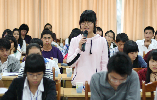 在互动环节中,学生代表们踊跃发言,提出“新生何时从临时宿舍搬迁到新宿舍的时间”、“热水供应时间”、“ 新图书馆开放日期”等一系列与学生生活密切相关的问题,相关部门负责人为此一一进行了耐心的解答并承诺会尽早解决。