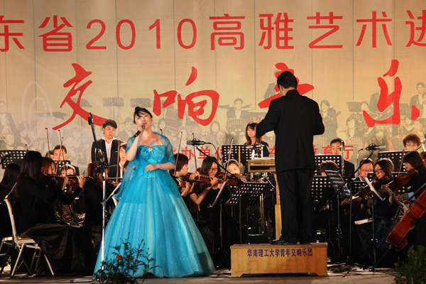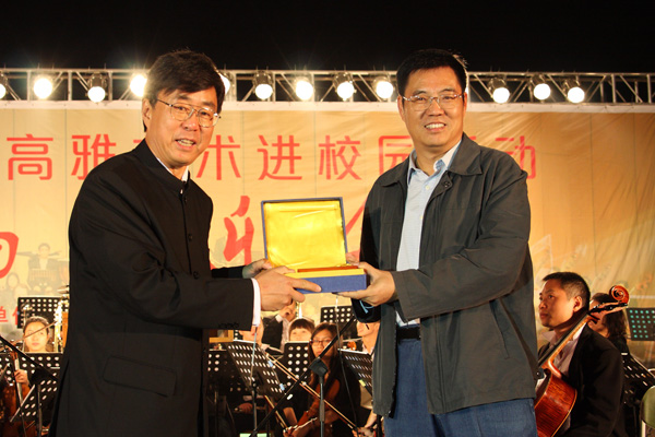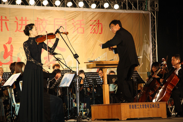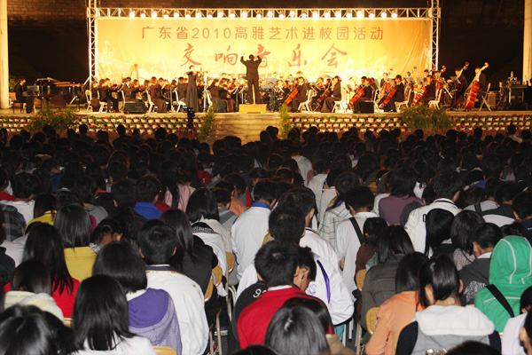 湛师新闻网12月1日讯 由广东省教育厅主办的“2010高雅艺术进校园活动--广东湛江师范学院专场交响音乐晚会”昨晚在我校雷阳广场隆重举行。我院罗海鸥院长、胡克伟副书记、李江凌副院长、华南理工大学艺术学院党委冯向阳书记、何平院长、米和平副院长、胡健副院长、王丽艳副院长及该院十多位系主任、专业教师和我校各二级学院师生代表一同欣赏了盛大的交响音乐会。