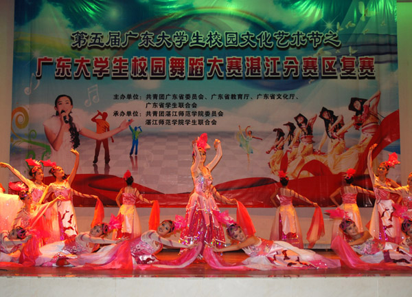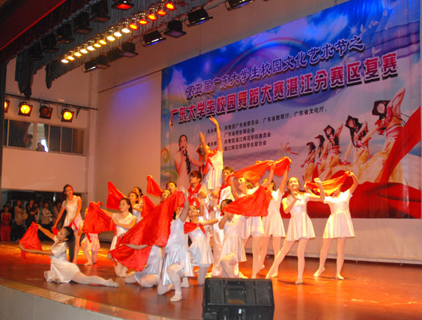 在下午的舞蹈大赛中,担任评委的是湛江市歌舞团吴葆萍老师、我校音乐学院艺术系朱培科主任、广东海洋大学王梓珊老师等。动感的舞姿、动人的旋律,舞台上的表演者们用优美的肢体语言为在场观众献上了一场极为震撼的视觉盛宴。在业余组的比赛中,来自我校的群舞《他们,她们》以轻灵飘逸的舞姿为全场观众描绘了一幅大学校园男生女生情谊真挚、共同成长的温馨画卷。广东石油化工学院以唯美温婉豪放、凸显民族异域风情的群舞《走在山水间》表达了青年学子的青春活力;《空巢的孩子》、《废墟上的赞歌》、《援手》等精彩表演相继上演,表演者用舞姿、用表情演绎了一个个感人的故事、扣人心弦。在专业组的比赛中,我校的群舞《江山如画》作为本赛区唯一一支专业组参赛舞蹈,参赛选手依然认真以对,她们以婀娜的舞姿和轻盈优美的舞步为观众展现了一幅壮丽河山图,将比赛推向了高潮。