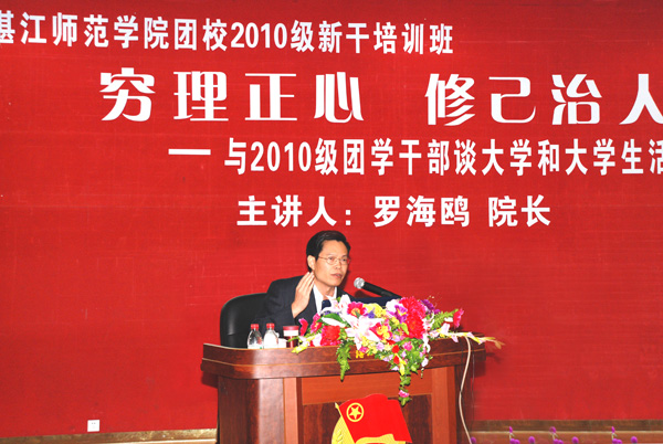 湛师新闻网11月17日讯 14日上午,校团委举办第八期团校培训班,学校罗海鸥院长为全体学员作了题为《穷理正心 修己治人——与2010级团学干部谈大学和大学生活》的辅导报告。法政学院盛国荣博士,院长办邓逢光主任,校团委李粤书记、李发武副书记,以及各二级学院团委书记参加了讲座。讲座由校团委李粤书记主持。