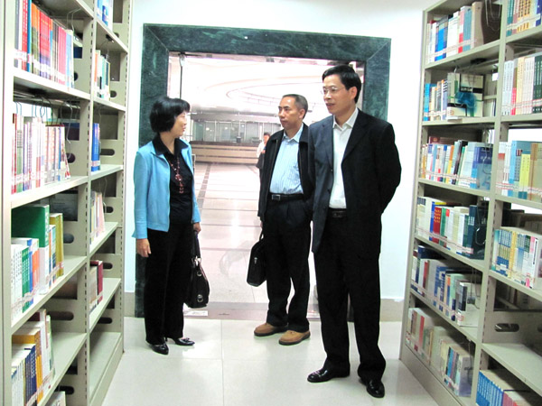 罗海鸥院长一行首先参观了采编部、各类文献室、特藏室和学生自习区等,询问了图书馆运行和新馆建设等方面情况。随后,又与图书馆中层以上干部进行座谈。