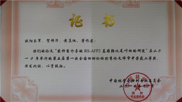 在中国生物化学与分子生物学会农业分会学术会议上,曾富华教授当选为新一届中国生物化学与分子生物学会农业分会理事。在此次会议上,黄真池博士做了题为“辣椒转基因育种的研究进展”的大会报告;在中国林学会举办的第五届第一次全国桉树论坛,曾富华教授做了题为“桉树转基因育种研究进展”的大会学术报告,欧阳乐军、黄真池、曾富华老师等共同撰写的《农杆菌介导的RS-AFP2基因转化尾叶桉的研究》获会议论文二等奖。