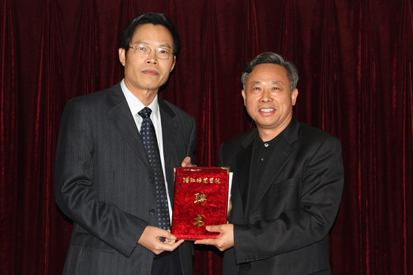 在商学院王亚新院长对张宜均总裁的生平事迹及卓越成就作简要介绍之后,学校罗海鸥院长为张总裁致欢迎辞并颁发了湛江师范学院客座教授聘书。罗院长在致辞中,对身兼鸿隆控股集团和鸿隆地产集团有限公司总裁的张宜均先生在百忙之中,不辞劳苦,莅临我校指导讲学,表示热烈的欢迎和诚挚的谢意。罗院长动情地说,张总裁从最初留在高校工作,到担任政府官员,再到下海经商,无论是为学、为政或者为商,每一次的转型都是一次“华丽的转身”,演绎了一段又一段精彩而成功的人生轨迹。张总裁有深厚的学理修养、丰富的党政工作经验和娴熟的商道智慧,受聘我校客座教授,担任同学们的导师,是学校和学生的荣幸和喜事,其将对商学院的发展和学生们带来许多有益的启示。