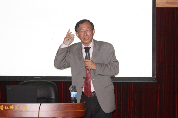湛师新闻网10月31日讯 10月29日晚,国际知名科学家黄惠良教授作客我校科学大讲坛,并作了“我的生涯规划与太阳能电池,兼论太阳能电池的前途与发展”的专题报告。学校罗海鸥院长、邵乐喜副院长,相关部门负责人以及物理学院师生出席了在图书馆学术报告厅举行的报告会。报告会由邵乐喜副院长主持。