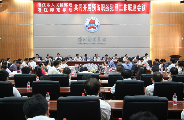 湛师新闻网10月21日讯 今天下午,我校与湛江市人民检察院于学校国际会议厅举行了共同开展预防职务犯罪工作首次联席会议。湛江市人民检察院检察长黄黎明、副检察长李向东、预防职务犯罪科全体人员,我校党委书记梁英、院长罗海鸥等校领导和副处级以上领导干部参加了联席会议。院长罗海鸥主持了会议,市检察院检察长黄黎明、我校党委书记梁英在会上作了讲话。