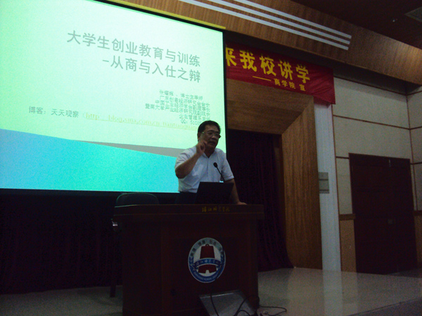 随后,张耀辉教授为我校师生作了一场以“关于大学生创业教育与训练—从商与入仕之辨”为主题的学术报告。张教授主要从事业心教育、大道德教育、成长教育、知识转化教育以及思维教育这几方面讲述了大学生从商以及开展创业教育的必要性并就如何开展创业教育提供了训练方法。张教授表示,创业教育应该以经济学为理论基础,通过经济学增强学生的理性思维能力,使创业构想具有活力。并主张创业教育是“道德教育+思维教育”性质的教育,弘扬克服困难,强调谋大局、做大事、克已利人的道德;进一步强调思维的训练。