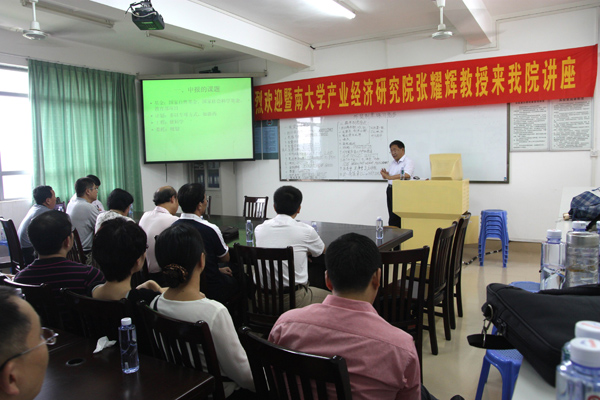 湛师新闻网10月10日讯 昨晚,我校图书馆学术报告厅举行了暨南大学产业经济研究院张耀辉副院长客座教授授聘仪式及学术报告。我校邵乐喜副院长、商学院王亚新院长、吴进书记、梁晋副书记、夏青副院长、邬建平副院长等领导班子成员以及商学院全体教师和学生出席了报告会。授聘仪式由邵乐喜副院长主持,学术报告会由商学院王亚新院长主持。