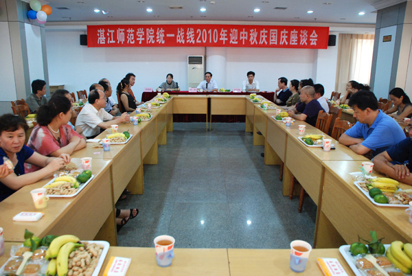 昨天下午,我校在学术交流中心召开统一战线2010迎中秋庆国庆座谈会暨教育思想大讨论。出席座谈会的有校党委梁英书记、邵乐喜副院长、统战部邓妍妍部长,我校的民主党派成员代表、无党派人士代表、人大代表、政协委员、留学归国人员、侨联会会员,少数民族教职工等各类统战成员代表。会议由邓妍妍部长主持。