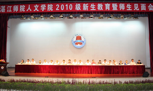 湛师新闻网9月14日讯 昨晚,人文学院在音乐厅举行2010级新生教育暨师生见面会。我校刘周堂副院长,人文学院院长熊家良,党委书记谢应明,副院长王钦峰、赵金钟,副书记冯基聪,人文学院各系部主任,及该院辅导员,2010级各班班主任,助理班主任等参加了见面会,会议由谢应明书记主持。