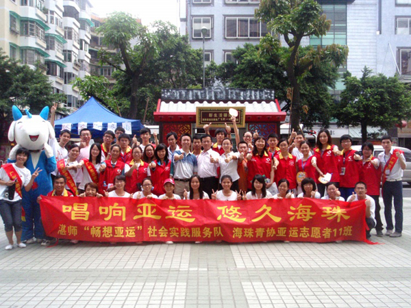 共青团广东省委员会学校部主任科员、教科院辅导员邓倩文同志和共青团海珠区委员会组宣部负责人舒亮同志出席了本次活动。活动分为“悠久海珠”摊位游戏、教科院与海珠青协共建仪式以及“唱响亚运”《一起来,更精彩》三大部分。游戏活动吸引了广大市民参与其中,让市民在游戏中了解亚运、支持亚运。共建仪式上,邓倩文同志把“湛江师范学院教育科学学院大学生社会实践基地”的牌匾交与了舒亮同志。舒亮同志向教科院赠送了亚运纪念品。在亚运期间,教科院将与海珠青协亲密合作,共同为广州亚运服务。共建仪式最后,由海珠青协代表为 “畅想亚运”社会实践服务队队长颁发了“亚运志愿者体验证书”。仪式结束后,在场的志愿者跳起亚运助威操,齐声合唱广州亚运志愿者歌曲《一起来,更精彩》,把现场的气氛推上了高潮。