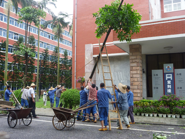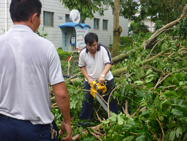 在物业管理中心钟伍雄科长的带领下,我校绿化工全部行动起来,奔赴工作地点。偌大的校园在狂风暴雨中摇曳,却能看到绿化工人的身影,雨点打在雨衣上噼哩啪啦像爆竹,打在脸上像针剌般疼,偶有走过的行人紧缩在伞下艰难的迈着步子,而我们的湛师绿化工们却在风横雨斜中清理着主校道上的残枝断树,或拖、或捡、或扛、或背、或锯,忙成一片。倒在路中的大树、折断后还挂在树上的树枝,都是重大的安全隐患,必须及时清除。直到晚上约十一时,主校道已基本畅通,领导和工人们才满意的拖着疲惫的身体踏上回家的路。