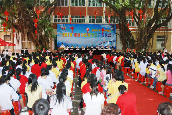 天上午,以“情系中华•相约湛江”为主题的“2010年湛台学生夏令营开营仪式”在我校古榕广场隆重举行,受到了各界人士的广泛关注。国台办交流局副局长何岚菁、省台办副主任蒋长芳、湛江市政府副市长赵平、市政协副主席廖旭材,台湾师范教育学会理事长、台中教育大学校长杨思伟,我校党委书记梁英、院长罗海鸥、副院长李江凌,广东海洋大学党委副书记张兰英、市委台办主任林鋆明、市教育局副局长苏盛,以及湛台两地联营的中学校长嘉宾和学生参加了开营仪式。湛江市委副秘书长刘耀千主持开营仪式。