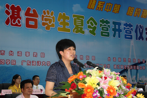 随后,台湾师范教育协会理事长、台中教育大学校长杨思伟为开营仪式致辞。杨校长介绍了台湾师生的行程,对支持夏令营活动的单位和领导致以诚挚的谢意,并表示“虽然湛江离台湾有一定的距离,但距离不是问题,重点是心连在一起”。湛江市政府赵平副市长也发表了讲话。赵副市长首先代表湛江市政府对夏令营开营表示热烈祝贺。她谈到,以“情系中华•相约湛江”为主题的湛台学生夏令营活动反映了海峡两岸关系的和谐发展,反映了两岸人民扩大交流、加强合作、促进发展的共同愿望,是两岸大交流大合作的体现,祝愿两岸的青年学子们携手共创中华民族的美好明天。国台交流局副局长何岚菁女士随后发表讲话。何副局长结合自己的一些见闻体会讲述了加强两岸交流的重要性。她说,百闻不如一见,只有加强交流才可以建立了解与理解、消除误解,希望同学们能通过夏令营活动开拓视野,增长知识,体验快乐,收获友谊。台中教育大学和我校的学生代表分别作了发言。