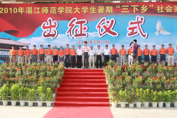 随后,出席启动仪式的领导和嘉宾为实践团队代表授旗。在我校大学生暑期社会实践主题曲《投身实践》激情演唱下,广东省教育厅李小鲁巡视员宣布:2010年湛江师范学院大学生暑期“三下乡”社会实践团队正式出征。响亮的礼炮,飘扬的队旗,翱翔的信鸽,展示出我校社会实践团队出征的豪情壮志,喷发出我校学子投身实践、深入基层、服务社会的青春激情。