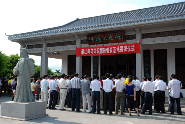 湛师新闻网7月5日讯 为了弘扬雷阳文化,学习和传承“清端”——陈瑸的廉政思想,7月2日,我校在雷州市附城镇南田村陈瑸的故里举行了“湛江师范学院廉政教育基地”揭牌仪式。我校领导梁英、黄钢、胡克伟、李永全、刘周堂等以及我校正处级(含副职主持工作)干部参加了揭牌仪式。我校党委书记梁英,雷州市政协主席陈秀琴在仪式上作了讲话,校党委副书记、纪委黄钢书记主持了揭牌仪式。