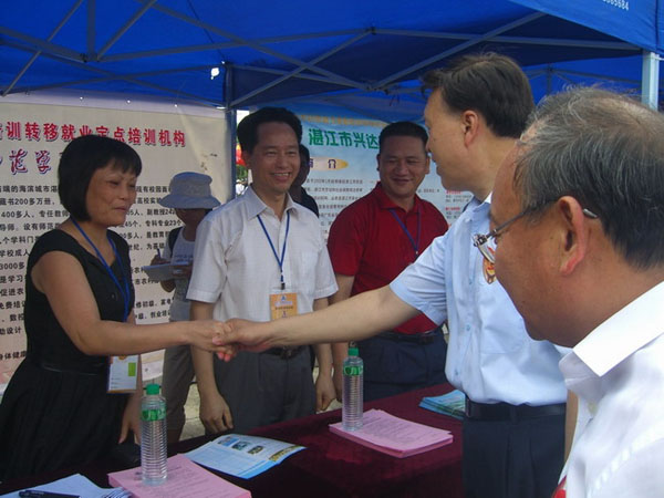 湛师新闻网7月1日讯 昨日下午,中共湛江市委、湛江市人民政府在湛江市体育中心举行 “广东扶贫济困日”启动仪式,我校继续教育学院黄树彬、陈艺来、黄碧珍和生科院陈水科等四位业务骨干参加了“技能扶贫现场咨询招生会”。在“技能扶贫现场咨询招生会”上,广东省肖志恒副省长、中共湛江市委陈耀光书记等省市领导到我院工作点视察。现场到我院工作点上咨询、索取招生简章的人员较多。