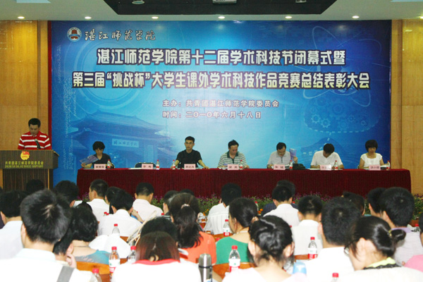 青春昭示希望,创新铸就梦想。6月18日晚,由校团委主办的我校第十二届学术科技节闭幕式暨第三届“挑战杯”大学生课外学术科技作品竞赛总结表彰大会在弘雷楼311室顺利举行。学校党委梁英书记、教务处朱城处长、学生处黄达海处长、校团委李粤书记、资产管理处许太金处长、图书馆黄慧薇馆长、思想政治理论课教学部洪小瑛副主任等出席了大会,参加大会的还有学生科技领导小组的其他领导老师和优秀作品的指导老师、获奖学生、基层团委负责人以及学生代表。
