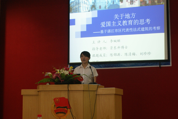 作为校第三届“挑战杯”立项课题,该调研组认为湛江市区保留有相当数量的较有代表性的法式建筑,是广州湾时期法殖民统治象征,更是地方爱国主义教育的重要资源。学术作品在对法式建筑的实地考察、走访和对多所中学进行问卷调研的基础上,挖掘法式建筑的潜在文化教育价值,分析考察和问卷调研结果,发现地方爱国主义教育的存在问题,同时建议各级政府部门和事业单位应充分发挥其职能,加强与社会各界力量的合作,采取各种有效手段和措施,不断保护并合理利用好法式建筑这一良好地方爱国主义教育资源,积极探索地方爱国主义教育体系的理论新模式。