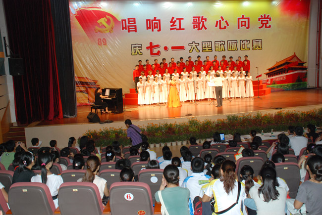当晚,来自13个二级学院和继续教育学院的师生党员用他们的歌声和热情,为建党八十九周年献上自己最诚挚的祝福。现场气氛热烈,歌声澎湃,掌声汹涌,喝彩、助威的浪潮一浪压过一浪,歌声的韵律在音乐厅的上空回荡。