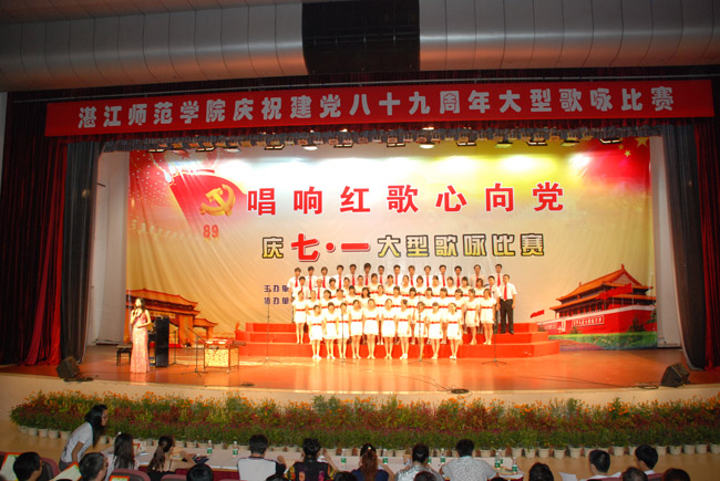 湛师新闻网6月14日讯 嘹亮的歌声在响起,浓厚的祝福在飘扬。6月13晚,在建党八十九周年纪念日即将来临之际,我校在音乐厅举行“唱响红歌心向党”庆“七·一”师生党员大型歌咏比赛。校党委梁英书记、胡克伟副书记、中国移动赤坎分公司市场经理林华洋先生,各个二级学院的党政领导、党群部门的负责人和各主办单位的领导及师生代表530多人观看了此次比赛。本次歌咏比赛由校党委组织部、团委、博雅教育中心、音乐学院主办,中国移动公司湛江分公司协办。