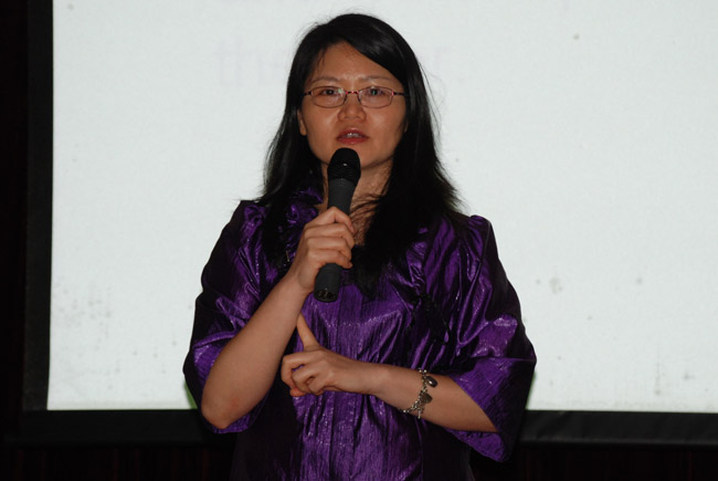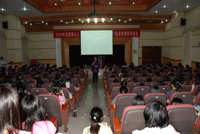 随后,邱碧娥博士用英文进行了一场生动的报告。在报告会上,邱博士首先引用一个小故事,让同学们明白第二语言的重要性。其后,主要围绕“听”与“读”两个方面,使用情景结合的方法,生动地剖析任务型教学的内涵。其中包括教学的动机、教学当中的信息差等方面的问题,让同学们亲身体验了任务型教学的实质,感受了一场真切的现身教育。