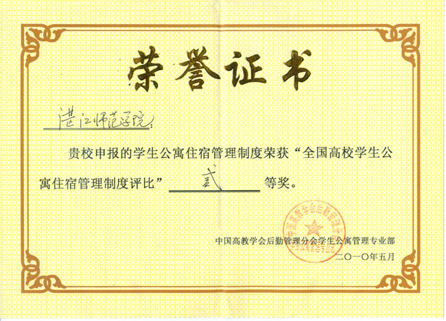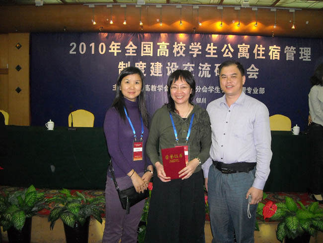湛师新闻网5月21日讯 2010年全国高校学生公寓住宿管理制度建设交流研讨会5月15日在宁夏银川举行,我校学生公寓管理中心报送的学生住宿系列管理制度在此次评选活动中荣获二等奖。我院学生处钟莉萍副处长、学生公寓管理中心陈奕鹏主任、罗艳丽副主任参加了会议。
