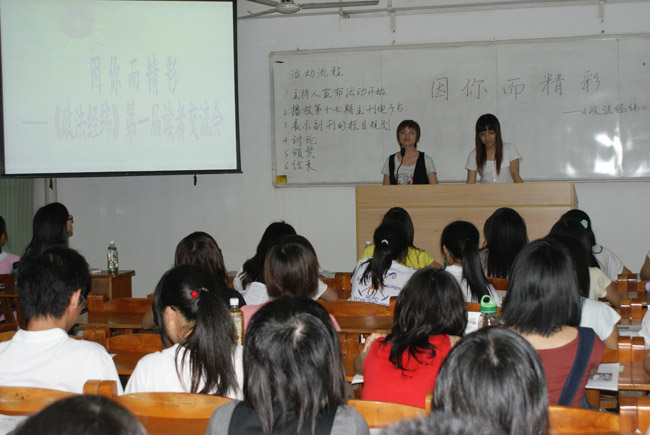 湛师新闻网5月18日讯 5月16日晚,法政学院宣传中心在弘雷楼502教室举行 “因你而精彩”第一届优秀读者交流大会。各学院的优秀作者与读者、第三届“全国高等院校学生语言文字基本功大赛”获奖者及《政法经纬》全体干部参加了交流会。