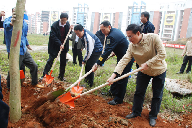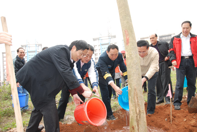 阮日生市长在我校梁英书记和罗海鸥院长的陪同下,将树苗植入树坑,然后铲土填坑、挥锹培土、提水浇灌,每道工序都做得十分严谨、认真、仔细。周围的领导、师生也热火朝天,忙得不亦乐乎。不久,100多棵风铃树、5000多棵桉树昂然挺立在燕雷文化广场上。在春光中,展现着蓬勃生机,萌发着盎然绿意,蕴含着我校成为“全国绿化模范单位”、“理想家园”的殷殷期盼。