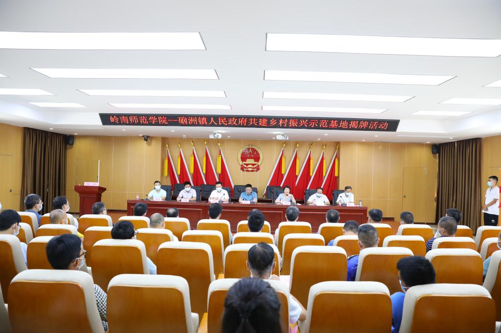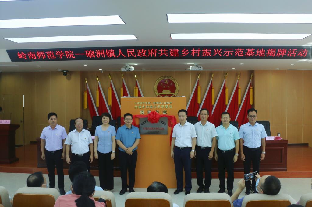 原国务院扶贫办党组成员司树杰同志特别代表、中国教育扶贫研究中心主任助理兼专家委员会常务副秘书长龚东卫,岭南师范学院党委书记兰艳泽,副校长苏古发,党委常委、宣传部部长刘坤章,湛江经开区党委副书记、管委会主任杨杰东,湛江市委农办常务副主任、市农业农村局党组副书记、市乡村振兴局常务副局长李建艺,湛江经开区硇洲镇委书记陈璞、镇长何荣磊共同为示范基地揭牌。揭牌仪式由湛江经开区硇洲镇镇长何荣磊主持。