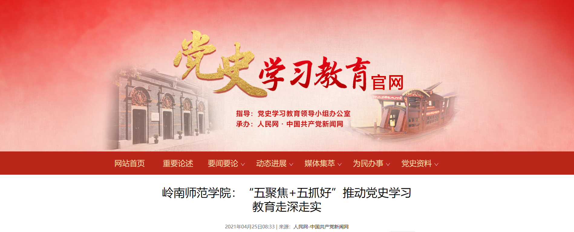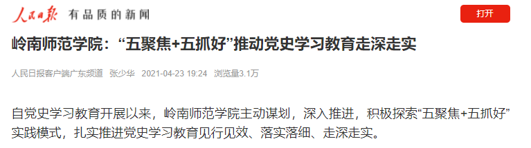 岭师新闻中心讯:4月23日,人民日报客户端刊发我校党史学习教育经验文章《岭南师范学院:“五聚焦+五抓好”推动党史学习教育走深走实》。截止4月25日,该文浏览量已高达3.1万。