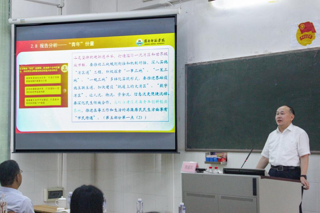 阳爱民生动形象的将党代会报告分析归纳为“1个灵魂”、“1条主线”、“5大经验”、“1个总目标”、“1张施工图”,并结合湛江实际、学校实际、学生实际等详细分析了党代会报告中的“湛江份量”、“教育份量”和“青年份量”。阳爱民强调,岭师学子要从党代会报告的“5大经验”、“政治保证”、“发展动力”、“一张施工图干到底”、“发展规划”、“社会对青年的关心”等方面汲取知识和力量,立大志、明大德、成大才、担大任,做奋发有为的青年,努力成为担当民族复兴大任的时代新人,始终朝着习近平总书记指引的方向勇毅前行。