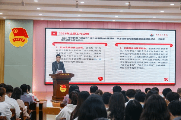 针对如何高质量推进学校共青团工作,黄达海提出三点明确要求:一是准确把握共青团的历史方位,在把握党和国家事业的前进方向中找准事业发展的切入点,在扎实的工作基础和优良传统中找准发展坐标,汇聚高质量发展“青春动能”;二是准确把握共青团工作的主线任务,围绕中心、服务大局,对接实施“广东青年下乡返乡兴乡助力‘百县千镇万村高质量发展工程’三年行动”,扎实推进毕业生就业帮扶,持续扩大工作成效亮点宣传效能,作出高质量发展“青春贡献”;三是准确把握共青团工作的基本方向,坚持政治建团、思想立团、固本兴团、改革强团、从严治团的原则和思路,深刻领会“建设一个什么样的团,怎样建设团”这一根本性问题,始终坚持党旗所指就是团旗所向,在新征程上擎起高质量发展“青春旗帜”。