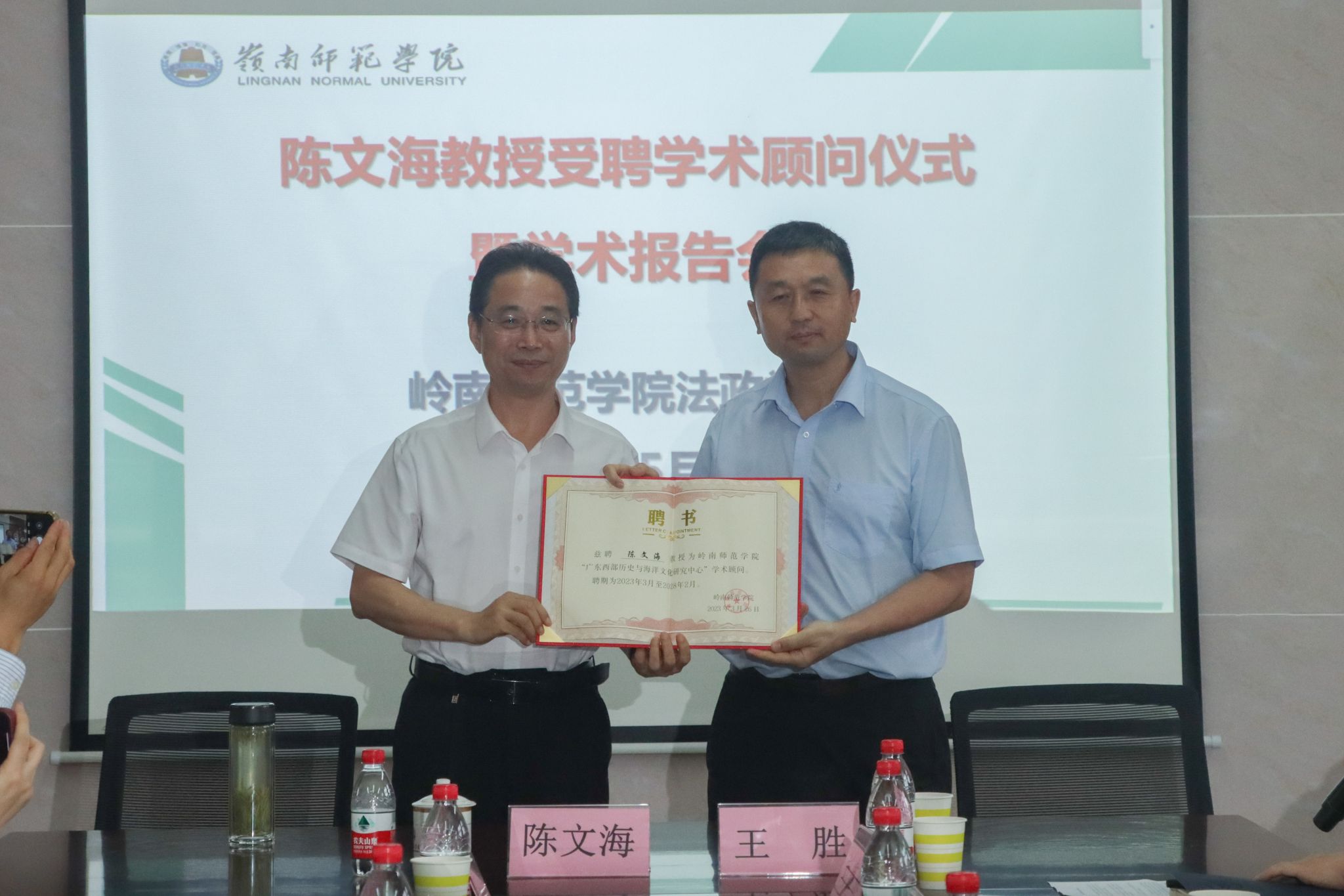 岭师新闻中心讯:5月9日下午,华南师范大学副校长陈文海教授应邀莅校作学术报告并受聘为广东西部历史与海洋文化研究中心学术顾问。受聘仪式在学校法政学院会议室举行。岭南师范学院副校长王胜为陈文海颁发聘书,华师帮扶工作队队长卢勃出席会议,法政学院院长刘鑫淼主持会议。