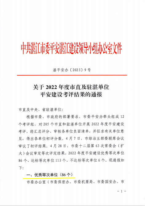 近日,中共湛江市委平安办下发《关于2022年度市直及驻湛单位平安建设考评结果的通报》,我校再次榜上有名,被评为“2022年度平安建设优秀等次”单位,这是我校连续第七年获得此荣誉。