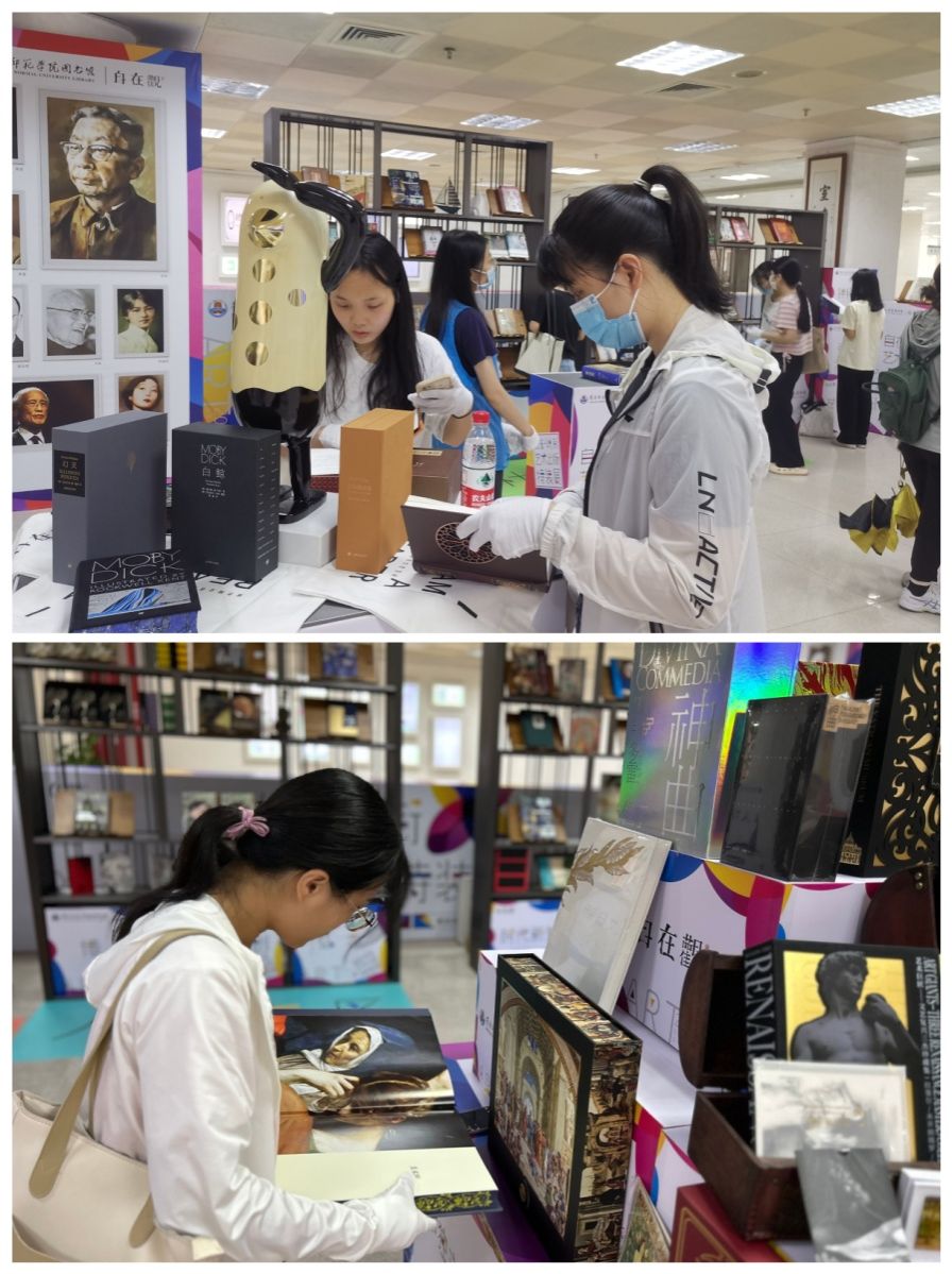 本次展出的特装书由我校校友创办的自在观独立书店提供。举办特装书展,主要是希望通过书展让师生读者走进精美的特装书世界,欣赏到美学、文化和知识的融合,收获难忘的阅读体验。同时也让读者们了解了特装书与普通图书的区别,特装书选取的图书都是具有高艺术价值或历史意义的经典著作,在装帧设计上使用了书口喷绘、印花、激光雕刻、热转印等复杂工艺,比普通图书具有更高的“艺术感”。