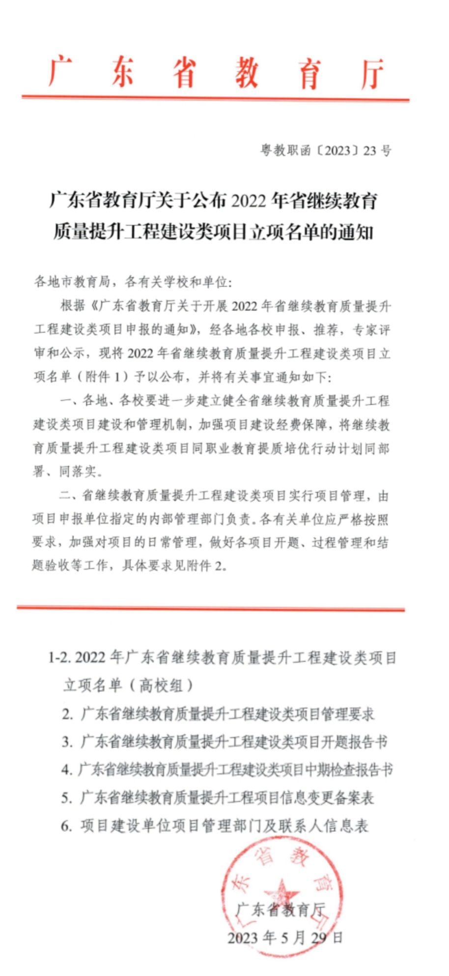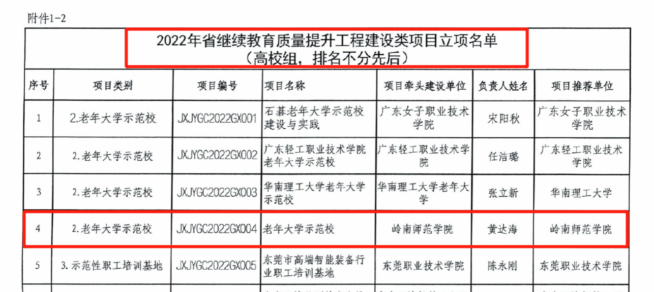 近日,广东省教育厅公布了《广东省教育厅关于公布2022年省继续教育质量提升工程建设类项目立项名单的通知》(粤教职函〔2023〕23号),由学校党委副书记黄达海主持申报的省继续教育质量提升工程建设类项目“老年大学示范校”成功立项,成为全省获批立项的两所本科院校之一。