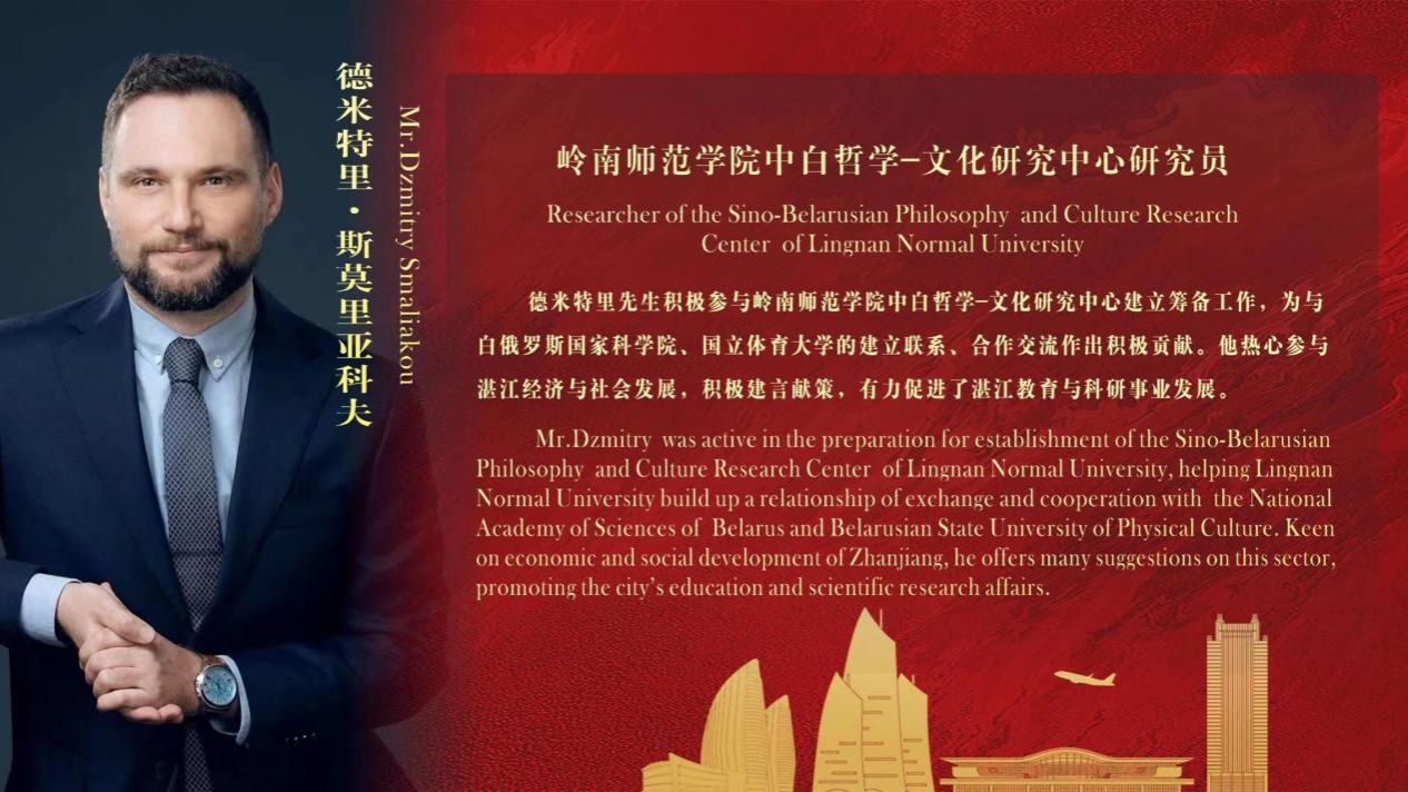 德米特里博士自2017年受聘来我校工作以来,充分发挥自身优势,借助各方资源,大力促进了我校与白俄罗斯国家科学院哲学研究所、白俄罗斯国立体育大学的合作。他积极参与了我校中白哲学-文化研究中心的建立筹备及运行工作,并助力推动了我校与白体大合办的孔子课堂升格为孔子学院。此外,德米特里博士还积极为湛江市经济建设及社会发展建言献策,为促进本市对外交流与合作、提升了湛江的国际形象做出了贡献。