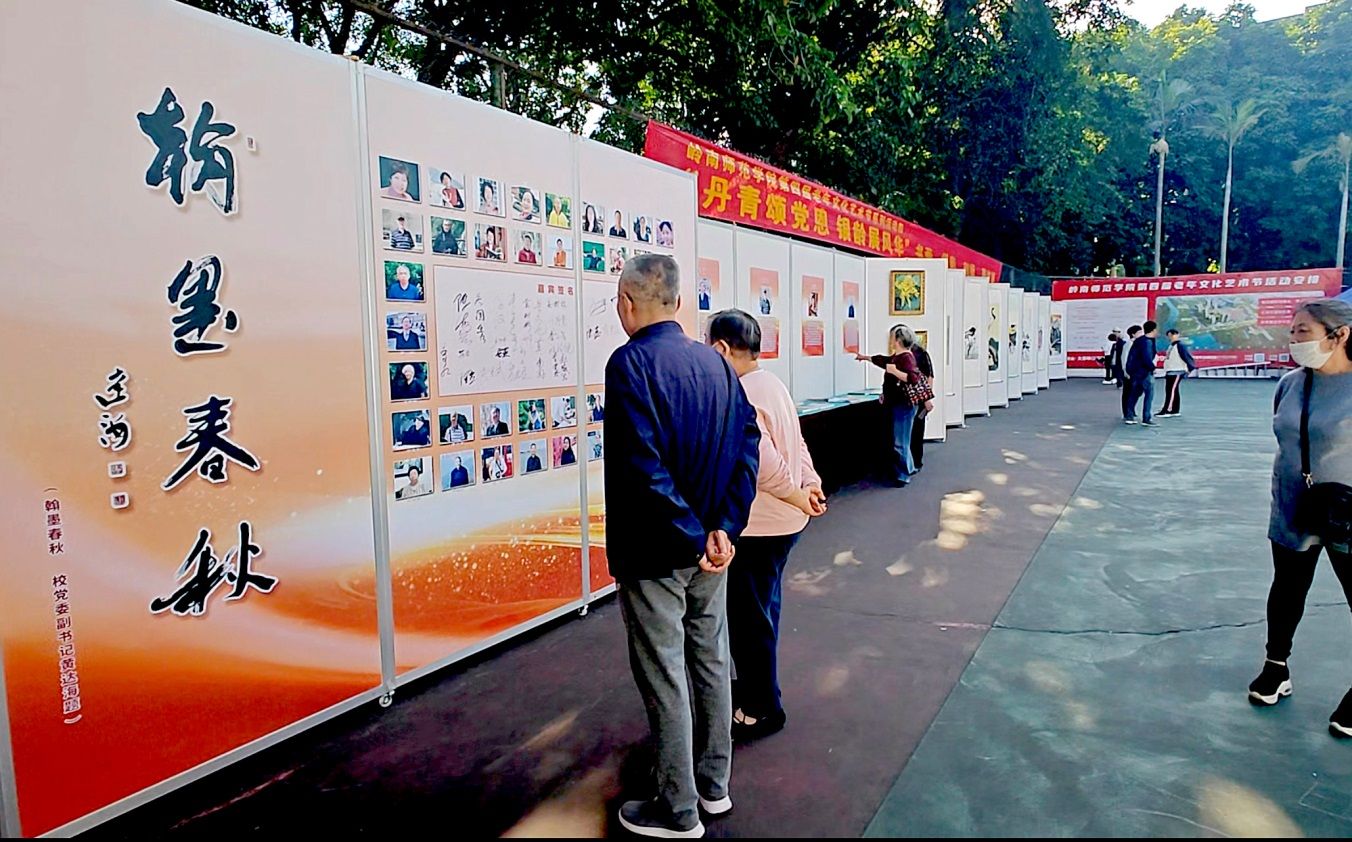 开展前,学校党委副书记黄达海专门为展览题写了“翰墨春秋”,以表达对广大离退休老同志一年四季坚持书画摄影、潜心笔耕创作的赞赏。他还特意来到现场观展指导,对展览给予高度评价。他指出,此次展览的筹划组织、作品质量、布展水平都有很大进步。广大老同志积极参与,认真创作,踊跃投稿,展现了岭师老同志深厚的文化底蕴和较高的艺术水准,也较好的展现了学校文化养老工作取得的丰硕成果。他强调,离退休人员服务中心不但要把室外展览办好,下步还要继续在室内推出展览,要让学校更多的师生参观学习,共享文化养老的成果,推进了“广东省老年大学示范校”的建设。