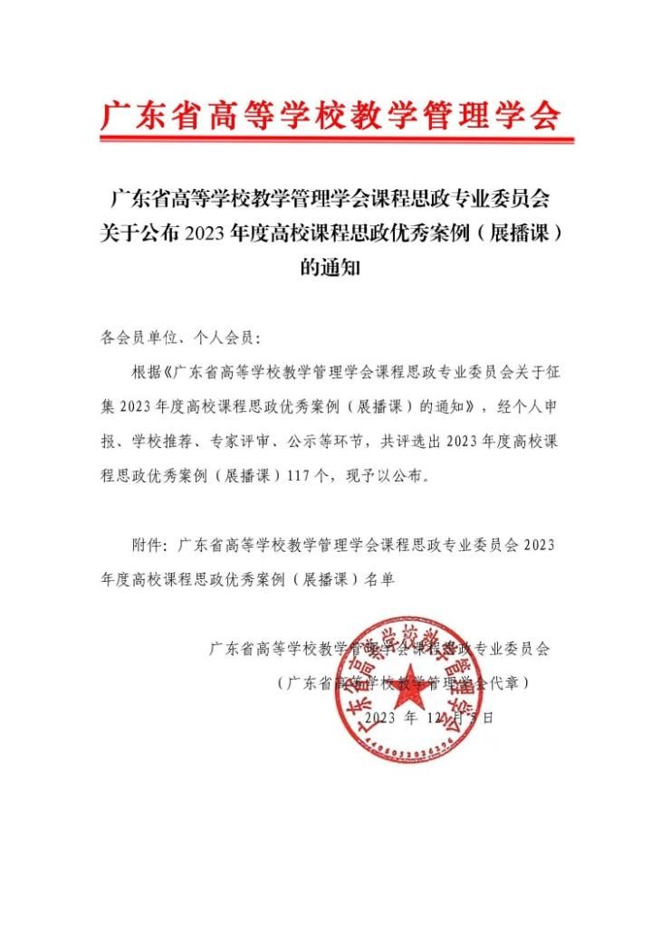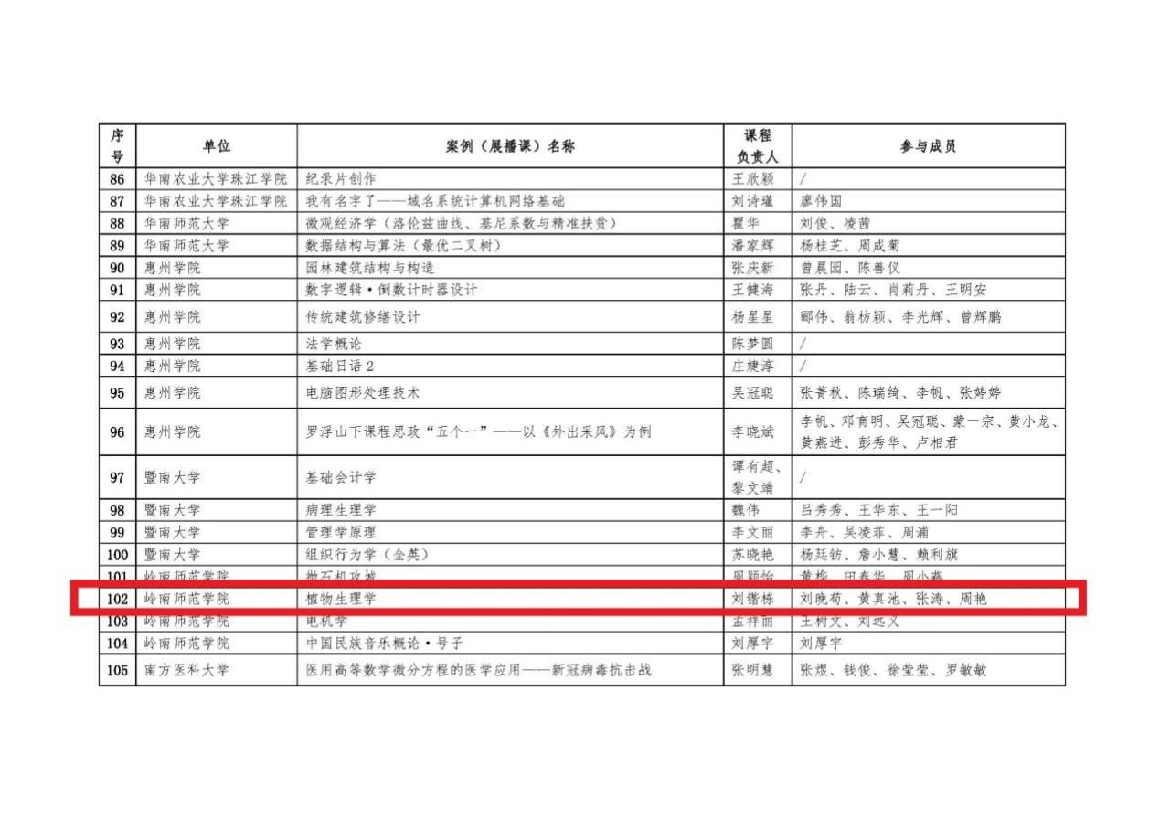 近日,由广东省高等学校教学管理学会课程思政专业委员会评选的“2023年度高校课程思政优秀案例(展播课)”名单正式公布,生科院刘锴栋、刘晚苟、黄真池、张涛、周艳等老师共同承担的《植物生理学》课程成功入选。