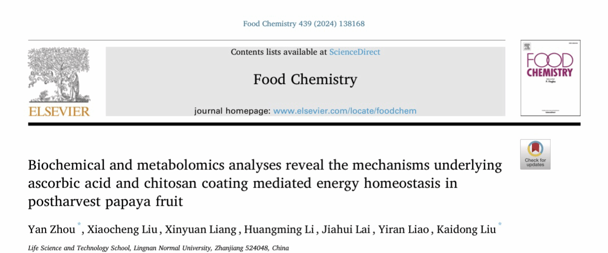 近日,FoodChemistry(中科院1区;IF=8.8)杂志在线发表了我校刘锴栋教授(通讯作者)、周艳副教授(第一作者)题为“Biochemical and metabolomics analyses reveal the mechanisms underlying ascorbic acid and chitosan coating mediated energy homeostasis in postharvest papaya fruit”的研究论文,该研究的前期研究结果“The combined effect of ascorbic acid and chitosan coating on postharvest quality and cell wall metabolism of papaya fruits”已发表于食品领域权威期刊《LWT》(中科院一区,IF=6)。本研究揭示了AsA和 CTS 处理能够通过调控番木瓜果实的能量平衡以保持贮藏品质。该结果有助于深入了解 AsA和 CTS处理调控番木瓜果实采后成熟和衰老的新机制。