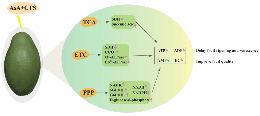 该研究发现,AsA+CTS处理能够通过增加丝氨酸脱氢酶(SDH)、细胞色素氧化酶(CCO)、H+-ATPase和Ca2+-ATPase活性以增强果实内线粒体能量代谢。同时能够使果实进一步积累琥珀酸,以维持细胞内较高的ATP和EC水平,为TCA循环的进行持续供应中间产物,从而直接调控果实的能量代谢。此外,AsA+CTS处理使糖代谢相关酶,如6-磷酸葡萄糖脱氢酶(6PGDH)和葡萄糖-6-磷酸脱氢酶(G6PDH)活性显著增加。AsA+CTS处理还能够通过增加NADPH和D-葡萄糖-6-磷酸的水平,为磷酸戊糖途径提供中间产物,间接调控果实内的能量代谢。结果表明,AsA+CTS处理能够通过调控 TCA、ETC和PPP,以维持果实的能量平衡,延缓果实的采后成熟和衰老,提高果实的耐贮性。这些结果为开发番木瓜采后贮藏保鲜技术提供了重要的理论基础。