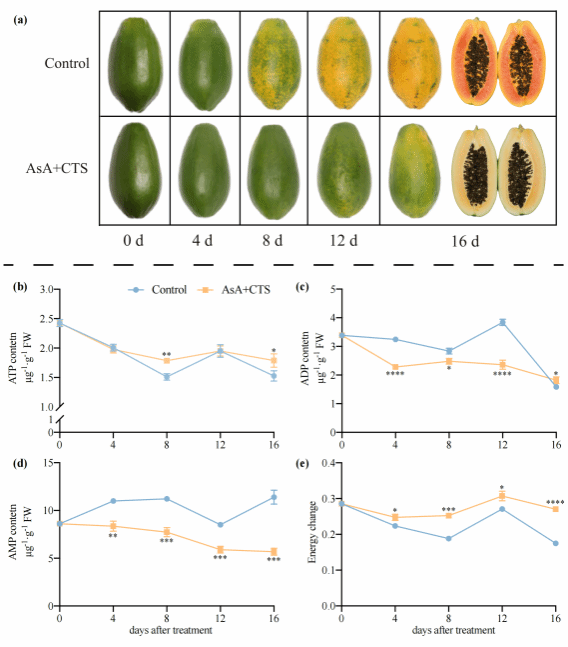 番木瓜广泛种植于我国广东、广西和福建地区,具有丰富的维生素、矿物质和酶类(如木瓜蛋白酶和淀粉酶)等物质。番木瓜属于呼吸跃变型果实,采收后果实仍然进行着活跃的代谢活动。为了保持果实的正常代谢活动和各种细胞功能,维持采后果实的ATP含量和能量平衡至关重要。前期研究发现,外源 AsA+CTS 处理能够通过提高番木瓜采后果实的抗氧化能力和降低其细胞壁代谢来延缓果实的采后成熟和衰老,以保持果实的贮藏品质。但是关于外源AsA+CTS 处理能否通过调控番木瓜采后果实的能量平衡有待深入研究。