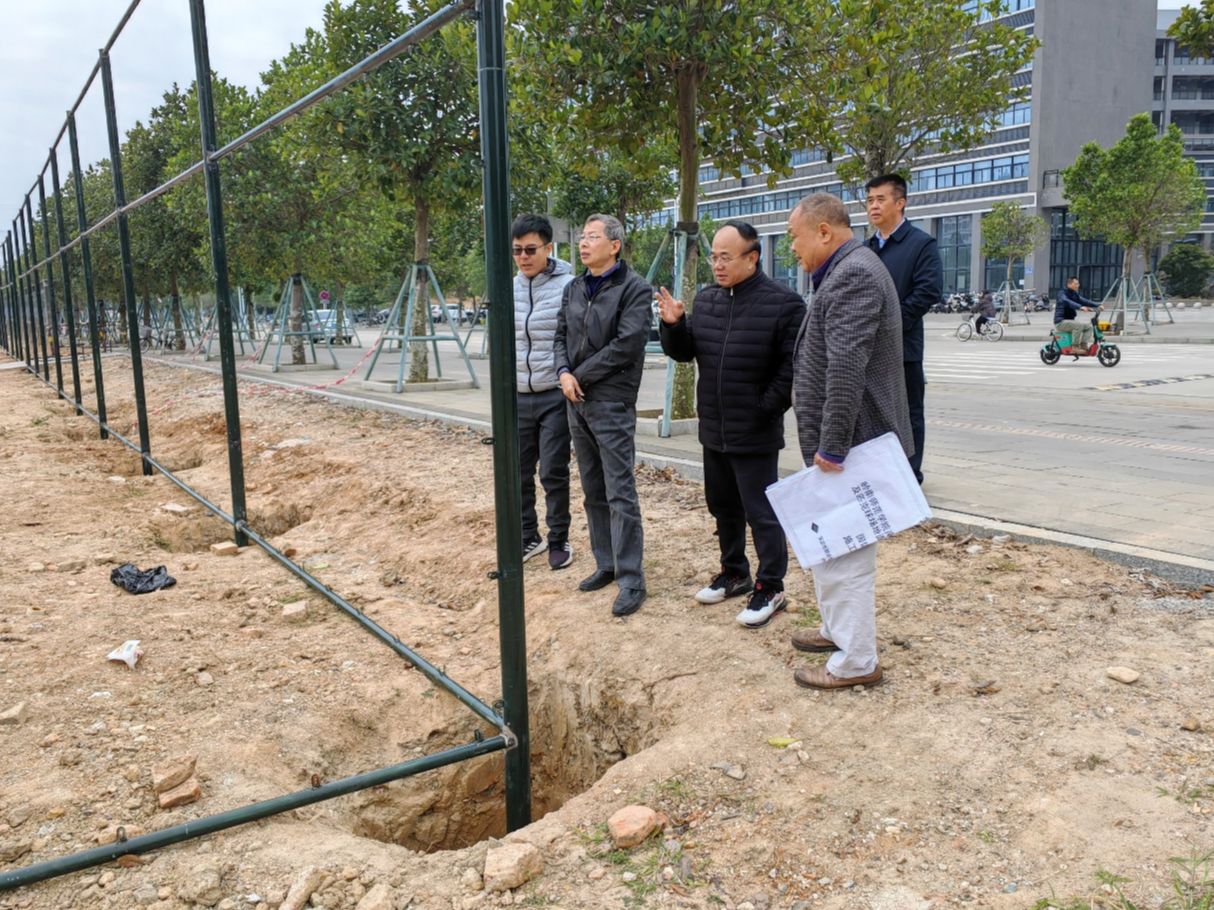 在南门运动场,苏古发指出,南门运动场围网工程建设有利于保护周边道路行人安全,对七人制足球、匹克球、链球、标枪等体育活动的落实具有重要意义,基建处要协调加快进度,使南门运动场尽快投入使用。来到围网立柱旁,苏古发亲自蹲下量取基坑尺寸,看到基坑埋深较浅的情况,提出“如此空旷地带,4m高的围网能否经受得住台风考验?”的疑问。施工单位表示,从施工经验来看,虽然基座深度不够,但是没有明确设计变更之前只能严格按图施工。现场管理人员、结构工程师王振波建议将基坑由800×800×500mm更改为800×800×800mm,这需要发函联系设计单位进行设计变更,苏古发表示同意。