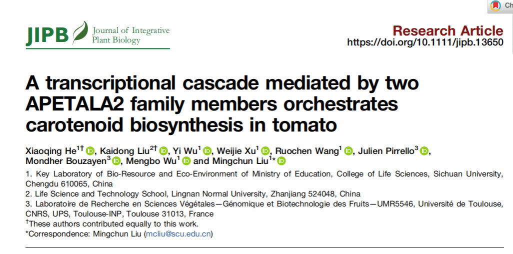 近日,我校生科院刘锴栋教授与四川大学刘明春教授在国际权威TOP期刊Journal of Integrative Plant Biology(中科院一区)联合发表题为“A transcriptional cascademediated by two APETALA2 family members orchestrates carotenoidbiosynthesis in tomato”的研究论文 (https://onlinelibrary.wiley.com/doi/10.1111/jipb.13650)。