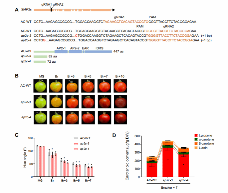 通过对在果实成熟过程中下调表达的SlAP2c的功能研究,发现该转录因子在番茄红素合成调控过程中发挥抑制作用。CRISPR/Cas9介导的基因编辑技术分别在 Micro-tom (MT) 和Ailsa Craig (AC) 番茄中敲除SlAP2c,番茄红素的积累显著增加,而使用果实成熟特异性启动子过量表达该基因则导致果实变黄且番茄红素的含量显著降低。进一步研究发现SlAP2c依赖其C末端的EAR基序招募辅抑制因子TPL2/4-HDA1/3复合体,并通过降低类胡萝卜素合成基因启动子区域的组蛋白乙酰化水平抑制这些基因的表达,进而抑制番茄红素的积累;此外,同家族转录因子SlAP2a作用于SlAP2c的上游并通过转录级联抑制AP2c,进而解除成熟过程中SlAP2c对番茄红素合成的抑制。该研究成果不仅深化了AP2/ERF家族成员之间级联调控果实色素合成的认识,也为番茄果实品质改良提供了新的靶点。
