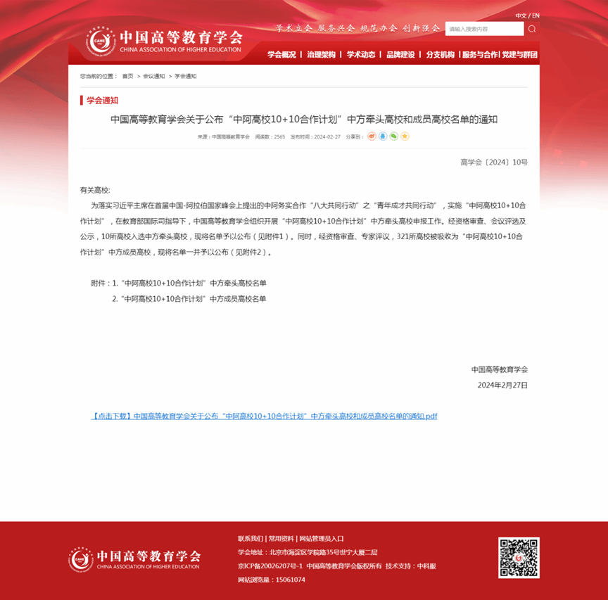 2月27日,中国高等教育学会公布“中阿高校10+10合作计划”高校名单,我校成功入选该计划中方成员高校。