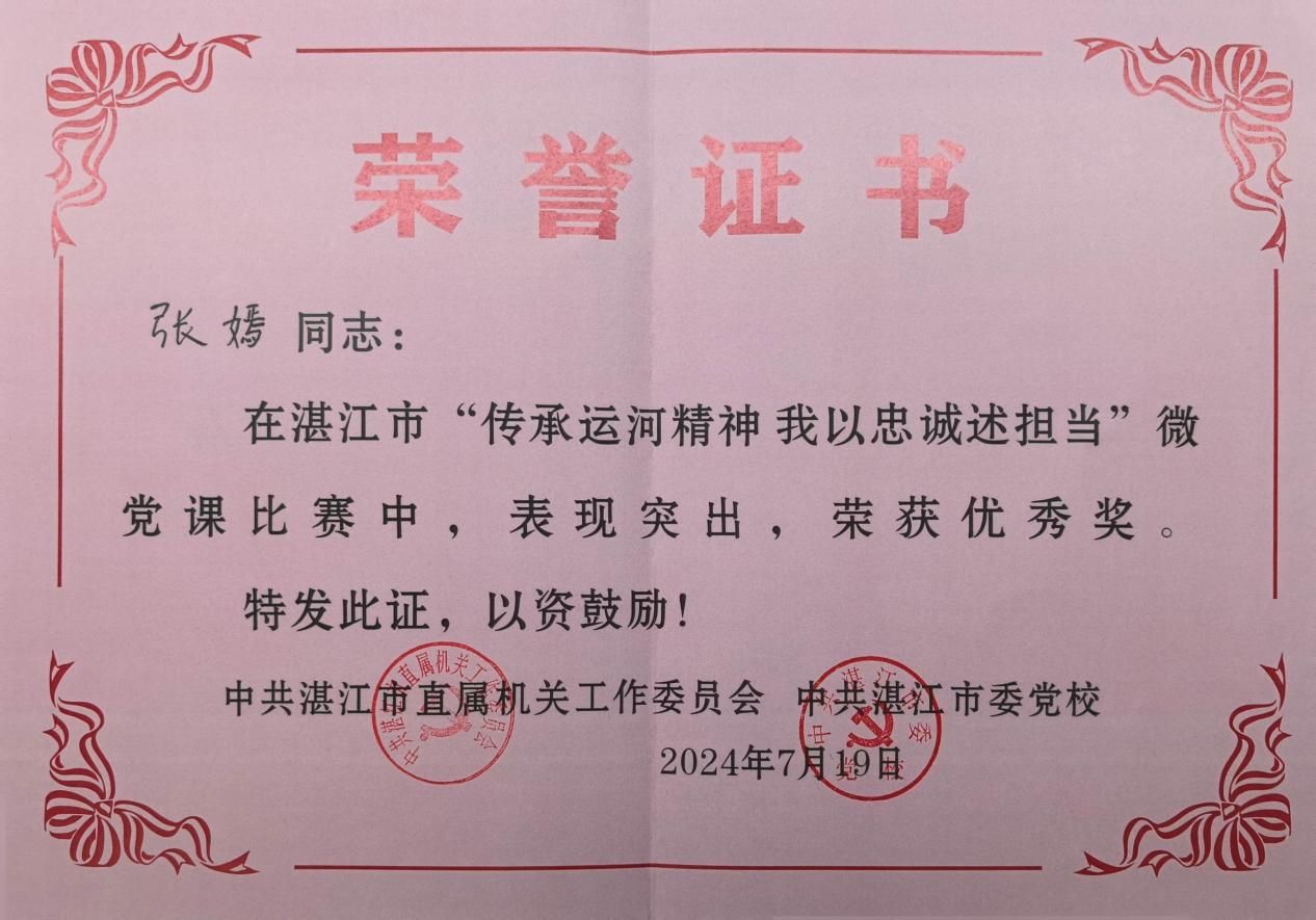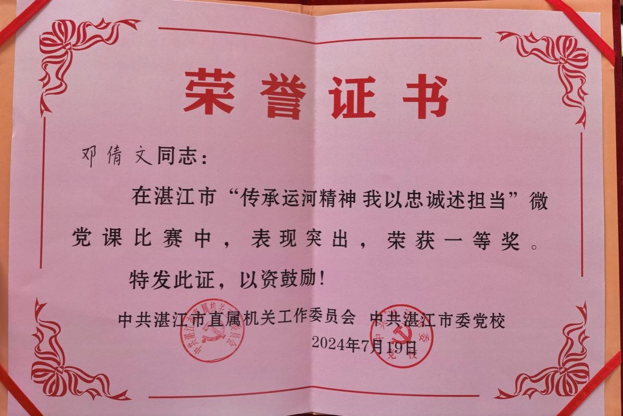 7月19日,湛江市“传承运河精神 我以忠诚述担当”微党课决赛在湛江市委党校报告厅举行。我校马克思主义学院党总支书记邓倩文、数学与统计学院辅导员张嫣从全市近150位参赛选手中获选进入决赛,是全市入选决赛选手最多的单位。经过角逐,邓倩文获一等奖,张嫣获优秀奖。